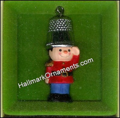 This 1979 Hallmark Ornament features a little soldier saluting, dressed in red and blue, wearing a thimble as a hat.