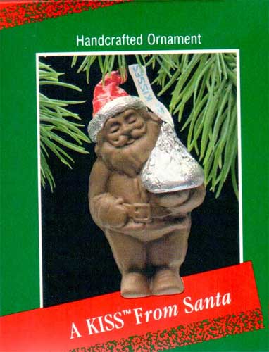 This 1988 Hallmark Christmas ornament is a chocolate lovers dream – a chocolate Santa Claus holding a wrapped Hershey Kiss.