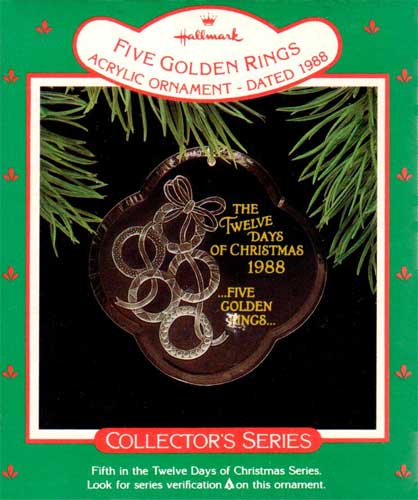 On the ornament, it reads: “The Twelve Days of Christmas 1988 … FIVE GOLDEN RINGS …”