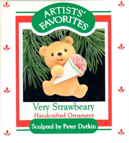 A light brown teddy bear with a strawberry snow cone is features in this 1988 Hallmark ornament.