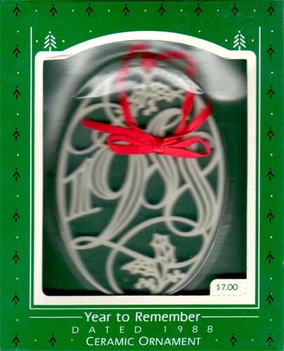 This 1988 Hallmark Keepsake Ornament is made of ceramic, and has a beautiful 1998 artistically crafted inside of an oval frame, complete with holly leaves.