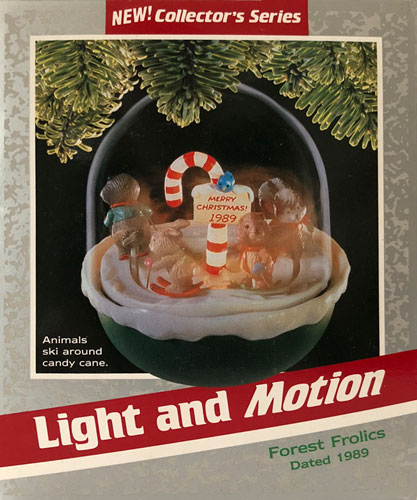Light and motion. Candy cane lights up as animals ski around it. Plugs in to standard miniature light string.