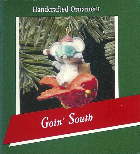 This 1989 Hallmark Keepsake Ornament features a little red bird with a traveling mouse on his back.