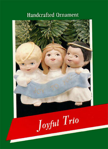 This 1989 Hallmark Keepsake Ornament features three angles singing together.