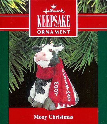 This Keepsake Ornament was originally produced and released by Hallmark in 1990.The ornament features a cow wearing a red scarf that reads “Mooy Christmas”