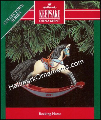 This white steed with black hair, red saddle and baby blue straps is eleventh in Rocking Horse Hallmark Ornament Series.