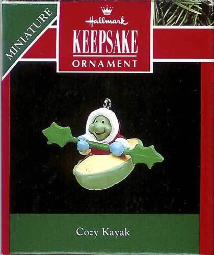 This 1992 Miniature Hallmark Ornament features a turtle using his shell as a kayak.