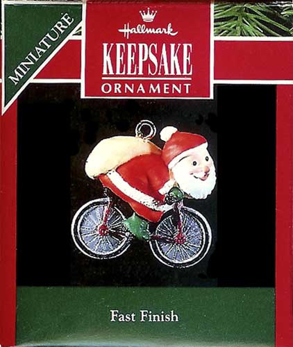 This Keepsake Ornament features Santa claus racing to finish delivering presents … on a bicycle.