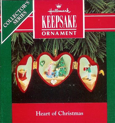 Inside the heart, there is a scene where the Christmas tree is being decorated. This Keepsake Ornament was originally produced and released by Hallmark in 1992.