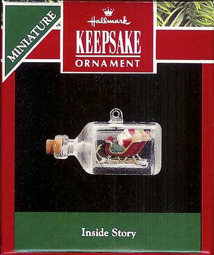 This 1992 Miniature Hallmark Keepsake Ornament has Santa and his sleigh … in a bottle!