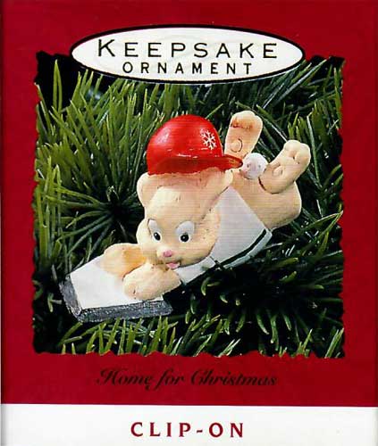 This Keepsake Ornament features a bunny sliding into home on Christmas.