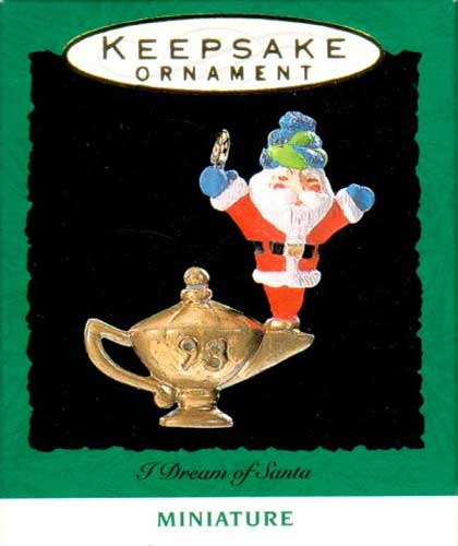 A play on words from I Dream of Jeanie, this 1993 Miniature Hallmark Ornament has Santa genie emerging from a magical lamp that is marked with a “93” on the side of it.