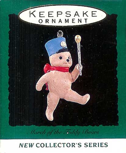 This 1993 Miniature Keepsake Ornament features a teddy bear leading a parade with a baton in hand.