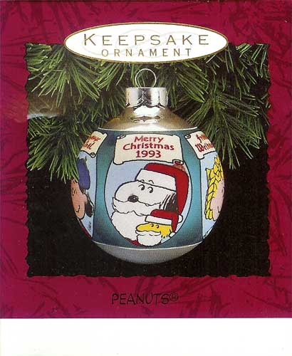 This 1993 Peanuts Keepsake Ornament is a silver glass ball with all of your favorite Peanuts characters on it, including Snoopy.