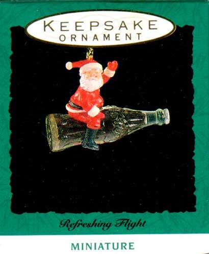 This 1993 Miniature Ornament has Santa taking a coke bottle for a ride.