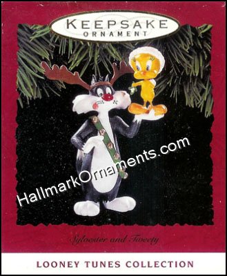 THis 1993 Hallmark Ornament features Sylvester and Tweety (from Looney Tunes) decked out in feative clothing.