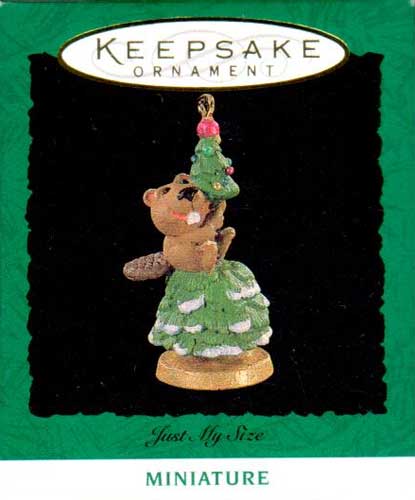 This 1994 Miniature Keepsake Ornament has a beaver cutting the top off a large pine tree to make the perfect sized Christmas tree for him.