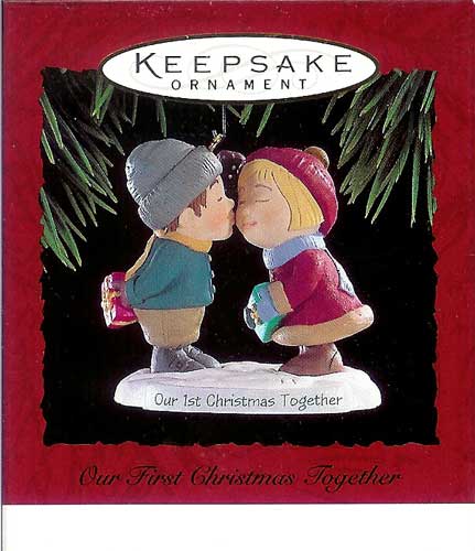 This Keepsake Ornament shows a couple enjoying a kiss and exchanging Christmas gifts.