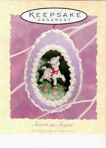This peekaboo egg features a purple egg with white lace. There is a cute little lamb with a red ribbon inside of a spring scene in the egg..