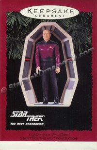 “Make it so.” The words spoken by Captain Jean-Luc Picard as he issues orders to his “Number 1” (Commander Riker) and the rest of his crew about the U.S.S. Enterprise NCC-1701-D. Captain Jean-Luc Picard (played by English actor Sir Patrick Stewart), was one of the youngest Starfleet captains ever, and was given command of the Galaxy-class starship U.S.S. Enterprise D.  Born in LaBerre, France, Captain Picard appeared for seven seasons in “Star Trek – The Next Generation, and appeared in four feature films from 1994 – 2002. This 1995 Hallmark ornament depicts the Enterprise Captain as he walks the corridors of the ship on his way to the bridge to order the crew to “Engage”