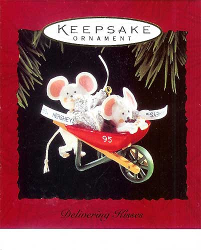 A couple of mice friends try to keep the holidays sweet by delivering some Hershey’s Kisses in a red wheel barrow in this 1995 Hallmark Keepsake Ornament.