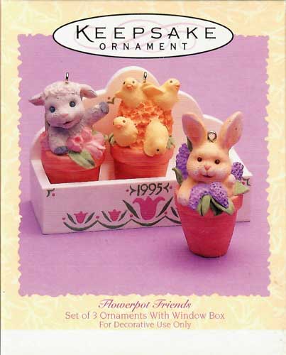A potted bunny ornament, a potted lamb ornament, a potted chicks ornament, and a “window box” that is dated 1995.