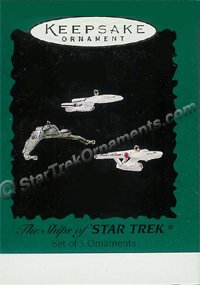 This set of three miniature Hallmark ornaments feature smaller versions of previoulsy released Hallmark keepsake ornaments – The Starship Enterprise from the original tv series, U.S.S. Enterprise 1701-D, and the Klingon Bird of Prey from Star Trek: The Next Generation. These miniature ornaments can hang independently, or be hung from the 2001 Space Station Deep Space Nine Hallmark ornament. When combined with the 2001 Starfleet Legends, you can create your own miniature Star Trek fleet. Size: Approx 1 1/2″ W each