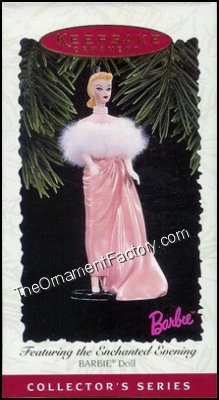 What an enchanted evening! Barbie adorned in a floor length pink gown with a white fur wrap. She is a show stopper! This Hallmark Ornament is the third in the Barbie Series.