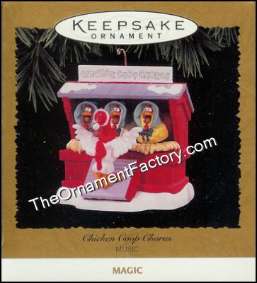 At your command, a talented trio of chickens will cluck a merry chorus of “Jingle Bells.” And when you gently tap the ornament, the chickens will nod their heads!