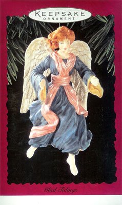 This Keepsake Ornament features an angel with a blue gown and red hair. The ornament was originally produced and released by Hallmark in 1996.