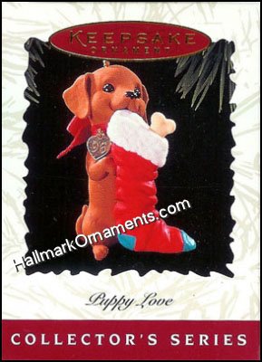 Sixth in the popular Puppy Love Hallmark Ornament series. This 1996 Hallmark Keepsake ornament is dated “96” on the heart shaped brass tag that hangs from the puppy’s collar.