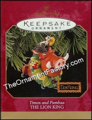 Pumba is wearing a wreath that he and his good pal, Timon, made from leaves that they had found from the jungle. This Hallmakr ornament has Timon riding on Pumbas back as they travel through their jungle home. From the Walt Disney classic, The Lion King.