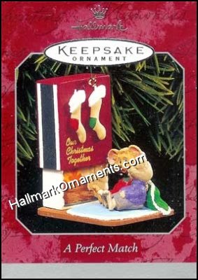 A couple of mouse stockings hung over a match box fire place. This Keepsake Ornament was originally produced and released by Hallmark in 1998.