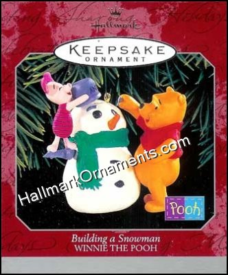 This Hallmark Keepsake Ornament has Winnie the Pooh and Piglet building a snowman. Piglet is putting a hunny pot on the snowman’s head as a hat. Artist: NA