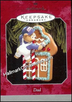 A dad painting a gingerbread house.    This Keepsake Ornament was originally produced and released by Hallmark in 1998.