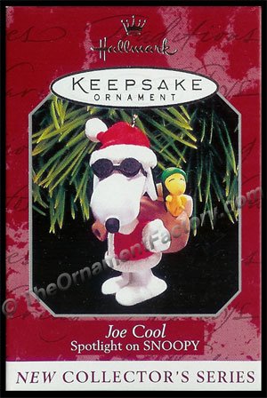 In this series of Keepsake Ornaments, as in his comic strip adventures, SNOOPY takes on a variety of roles. Here, with his pal WOODSTOCK, heâ??s campus personality â??Joe Cool,â? ready to help old St. Nick.