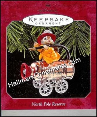 A mouse fire fighter gets ready to use an old fashioned fire extinguisher that is mounted on wheels. This Keepsake Ornament was originally produced and released by Hallmark in 1998.