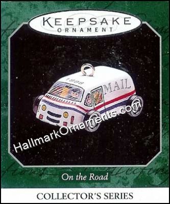 Sixth and FINAL in the On the Road series. This ornament features a mail truck. Made of tin. This Keepsake Ornament was originally produced and released by Hallmark in 1998.