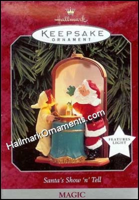 Features light!   This Magic Keepsake Ornament was originally produced and released by Hallmark in 1998. The back of the ornament reads: “Santa nad his magic light sned shadows dancing on the wall – A dog, a doll, a big-eared bunny – turn the wheel to see them all.” Dated 1998 Plug this magic ornament into any standard miniature light string socket.