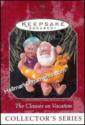 Mr and Mrs Claus decide to go for a swim while on vacation. This Keepsake Ornament was originally produced and released by Hallmark in 1998. Second in The Caluses on Vacation Hallmark ornament series.