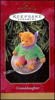This 1999 Hallmark Ornament features a brown bear with a pink scarf holding a saucer sled that reads “1999 Granddaughter” on the inside of the saucer.