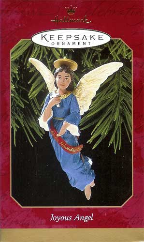 This 1999 Keepsake Ornament features a Hispanic angel wearing a blue gown with a red sash.