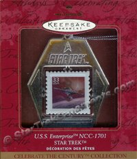 The U.S.S Enterprise NCC-1701 from the original television series, Star Trek, was commemorated on a 33 cent United States postage stamp, as featured in this 1999 Hallmark Keepsake Ornament. The metal frame has “Star Trek” embossed on it. The center of the metal frame has a ceramic center that shows the constiution class Enterprise on the front side, and is marked: “Celebrate 100 The Century” for the US Postal Service on the back side. Note: The metal on this piece easily tarnishes, and we do not distinquish the condition of the ornament because of tarnish. The tarnish can be easily removed with ordinary tarnish remover.Size: 3″H