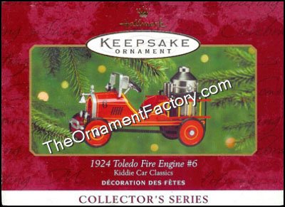 In the early 1920s, as motorized fire engines began to replace horse-drawn hose wagons, pedal car versions started to appear on neighborhood sidewalks. In 1924, the Toledo Metal Wheel Company offered youngsters one of the most striking fire engine pedal cars ever trusted to protect a neighborhood. The original Fire Engine #6, with its nickel-plated boiler, outshone other pedal cars and rescued its share of stuffed animals from precarious perches. This series of Keepsake Ornaments hightlights pedal cars produced from the 1920s to the 1960s.