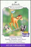 Frolocking Friends is a Hallmark Keepsake Ornament set. The three ornaments are Bambi, Thumper, and Flower from Disney’s movie Bambi. Artist: Katrina Bricker