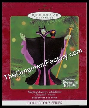 This Hallmark Keepsake Ornament is the last of the Unforgettable Villain Series. There were two others, Cruella De Vil from 101 Dalmations and The Jealous Queen from Snow White. Maeficent wears a black robe with the sleves lined in purple. She has her crow on her shoulder and is holding a septor. Artist: Joanne Eschrich