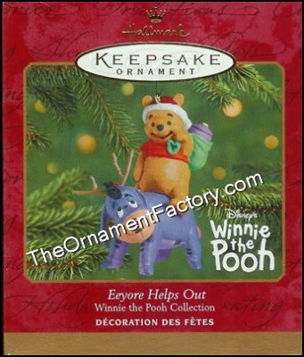 What are friends for? Eeyore wearing antlers is giving Santa Pooh a ride to deliver the packages in the Santa pack. Eeyore Helps Out is a Hallmark Keepsake Ornament from the Winnie the Pooh Collection. Size: 3″ H