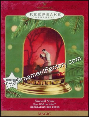A unique ornament – Reflects one of the most breathtaking scenes in the film Gone With the Wind. As the city of Atlanta burns, Captain Rhett Butler guides a stolen horse and wagon through the flames and mobs to rescue Scarlett O’Hara, Prissy, Melanie Wilkes, and her baby. Rhett then lifts Scarlett from the wagon and bids her farewell. Scarlett, frightened and angry, cannot believe that he could leave her to join the retreating troops. Dialogue from this famous scene appears on the back of this ornament.