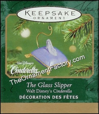 A beautiful glass slipper set upon a blue pillow for Prince Charming to take around the countryside to find the pretty woman who fits into ths shoe. The Glass Slipper is a miniature Hallamrk Keepsake Ornament and was released in 2001. From the classic Walt Disney film, Cinderella.