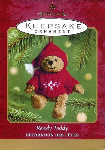 This 2001 Hallmark ornament is a plush teddy bear, complete with a knitted sweater and hat, is made of fabric